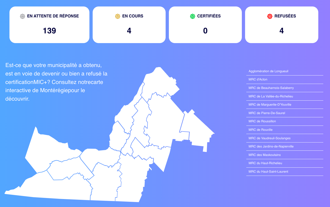 Consulte la carte interactive pour voir quelles municipalités ont déjà obtenu la certification MIC+ et découvre les initiatives qu’elles ont mises en place.